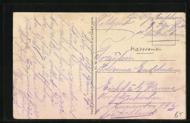 Personenbezogene Daten auf der Rückseite der Karte wurden durch blauen Textmarker unkenntlich gemacht. Die blauen Stellen sind auf die Vorderseite durchgeweicht und wirken sich negativ auf das Postkartenfoto aus