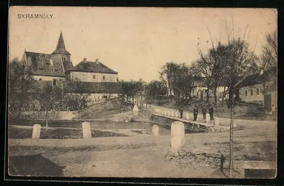 AK Skramniky, Strassenpartie am Wasser mit Blick zur Kirche