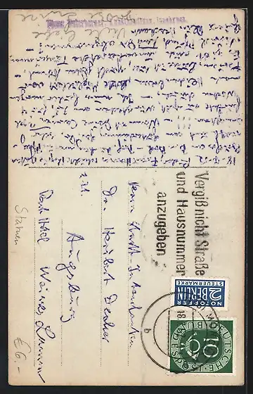 Personenbezogene Daten auf der Rückseite der Karte wurden durch blauen Textmarker unkenntlich gemacht. Die blauen Stellen sind auf die Vorderseite durchgeweicht und wirken sich negativ auf das Postkartenfoto aus