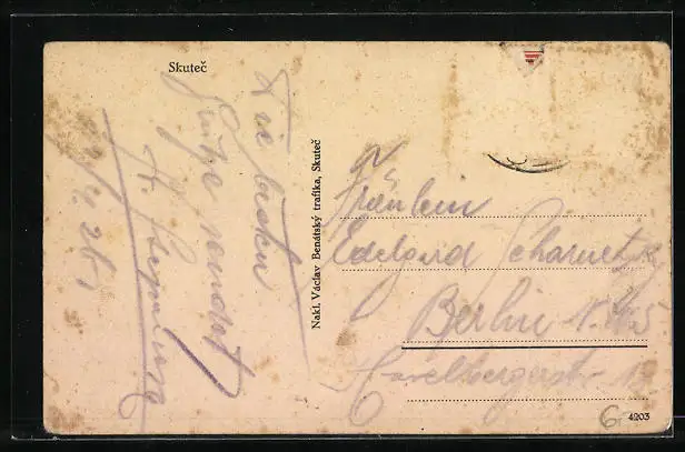 Personenbezogene Daten auf der Rückseite der Karte wurden durch blauen Textmarker unkenntlich gemacht. Die blauen Stellen sind auf die Vorderseite durchgeweicht und wirken sich negativ auf das Postkartenfoto aus