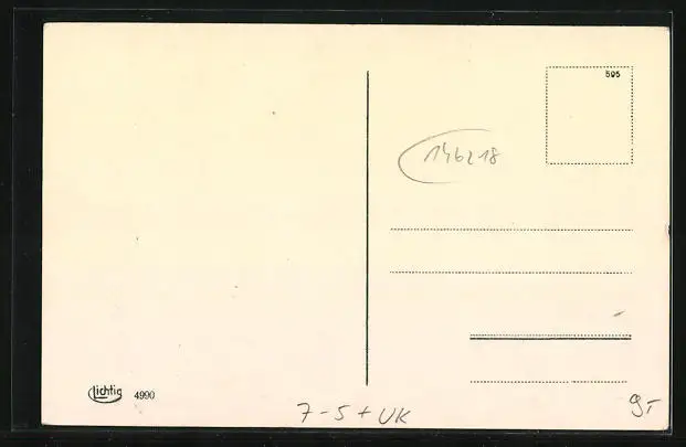 Personenbezogene Daten auf der Rückseite der Karte wurden durch blauen Textmarker unkenntlich gemacht. Die blauen Stellen sind auf die Vorderseite durchgeweicht und wirken sich negativ auf das Postkartenfoto aus