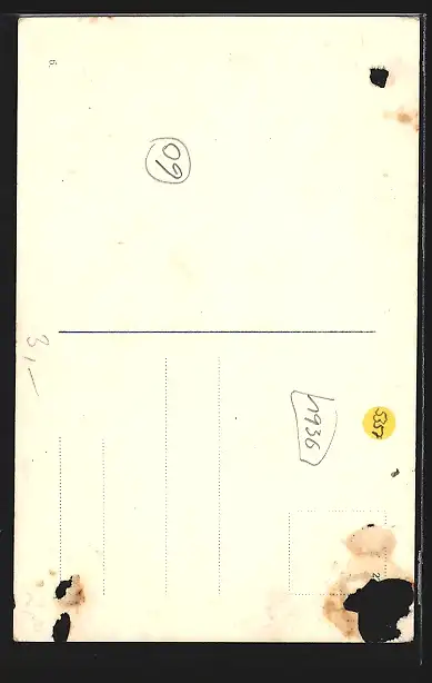 Personenbezogene Daten auf der Rückseite der Karte wurden durch blauen Textmarker unkenntlich gemacht. Die blauen Stellen sind auf die Vorderseite durchgeweicht und wirken sich negativ auf das Postkartenfoto aus