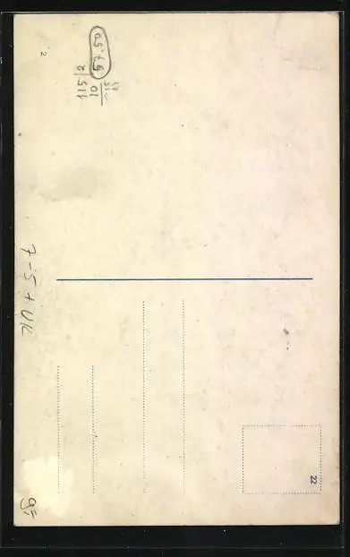Personenbezogene Daten auf der Rückseite der Karte wurden durch blauen Textmarker unkenntlich gemacht. Die blauen Stellen sind auf die Vorderseite durchgeweicht und wirken sich negativ auf das Postkartenfoto aus