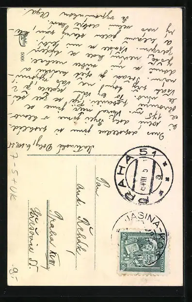 Personenbezogene Daten auf der Rückseite der Karte wurden durch blauen Textmarker unkenntlich gemacht. Die blauen Stellen sind auf die Vorderseite durchgeweicht und wirken sich negativ auf das Postkartenfoto aus