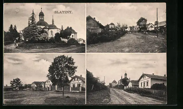AK Slatiny, Kirche, Feldweg, Wohnhäuser