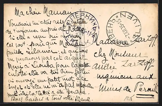 Personenbezogene Daten auf der Rückseite der Karte wurden durch blauen Textmarker unkenntlich gemacht. Die blauen Stellen sind auf die Vorderseite durchgeweicht und wirken sich negativ auf das Postkartenfoto aus
