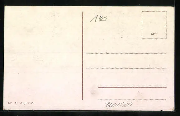 Personenbezogene Daten auf der Rückseite der Karte wurden durch blauen Textmarker unkenntlich gemacht. Die blauen Stellen sind auf die Vorderseite durchgeweicht und wirken sich negativ auf das Postkartenfoto aus