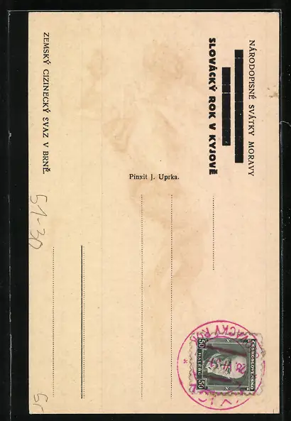 Personenbezogene Daten auf der Rückseite der Karte wurden durch blauen Textmarker unkenntlich gemacht. Die blauen Stellen sind auf die Vorderseite durchgeweicht und wirken sich negativ auf das Postkartenfoto aus