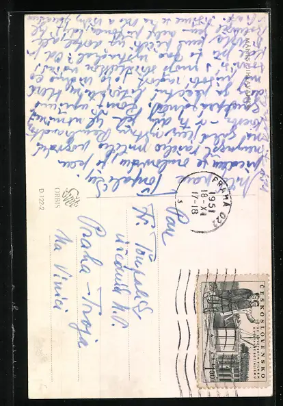 Personenbezogene Daten auf der Rückseite der Karte wurden durch blauen Textmarker unkenntlich gemacht. Die blauen Stellen sind auf die Vorderseite durchgeweicht und wirken sich negativ auf das Postkartenfoto aus