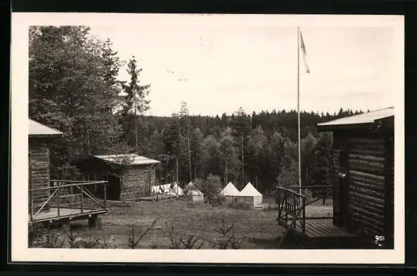 AK Smilovy Hory, Holzhütten auf einer Waldlichtung
