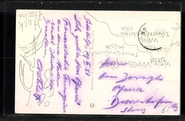 Personenbezogene Daten auf der Rückseite der Karte wurden durch blauen Textmarker unkenntlich gemacht. Die blauen Stellen sind auf die Vorderseite durchgeweicht und wirken sich negativ auf das Postkartenfoto aus