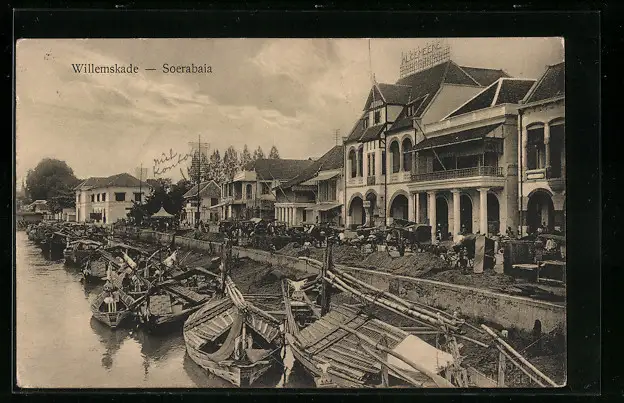 AK Soerabaia, Willemskade mit Booten und Kutschen