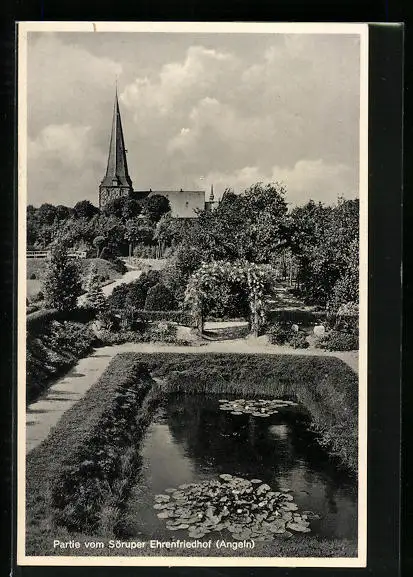 AK Sörup, Teich auf dem Ehrenfriedhof, Blick zur Kirche