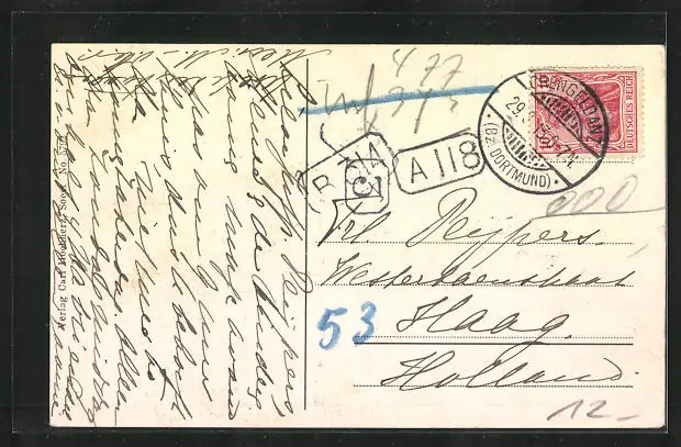 Personenbezogene Daten auf der Rückseite der Karte wurden durch blauen Textmarker unkenntlich gemacht. Die blauen Stellen sind auf die Vorderseite durchgeweicht und wirken sich negativ auf das Postkartenfoto aus