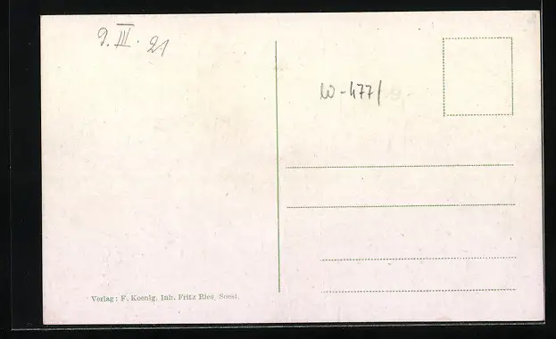 Personenbezogene Daten auf der Rückseite der Karte wurden durch blauen Textmarker unkenntlich gemacht. Die blauen Stellen sind auf die Vorderseite durchgeweicht und wirken sich negativ auf das Postkartenfoto aus