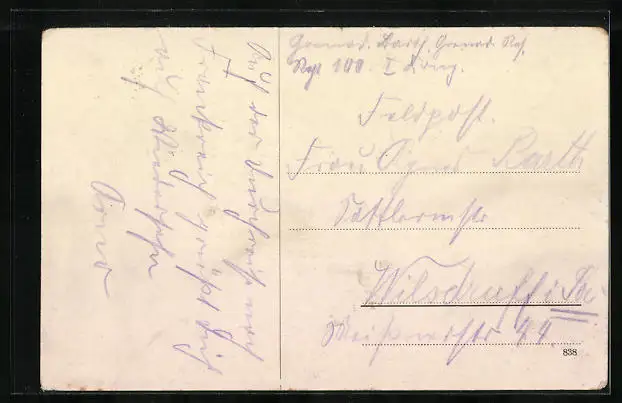 Personenbezogene Daten auf der Rückseite der Karte wurden durch blauen Textmarker unkenntlich gemacht. Die blauen Stellen sind auf die Vorderseite durchgeweicht und wirken sich negativ auf das Postkartenfoto aus