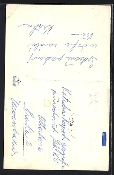 Personenbezogene Daten auf der Rückseite der Karte wurden durch blauen Textmarker unkenntlich gemacht. Die blauen Stellen sind auf die Vorderseite durchgeweicht und wirken sich negativ auf das Postkartenfoto aus