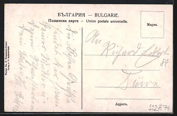 Personenbezogene Daten auf der Rückseite der Karte wurden durch blauen Textmarker unkenntlich gemacht. Die blauen Stellen sind auf die Vorderseite durchgeweicht und wirken sich negativ auf das Postkartenfoto aus
