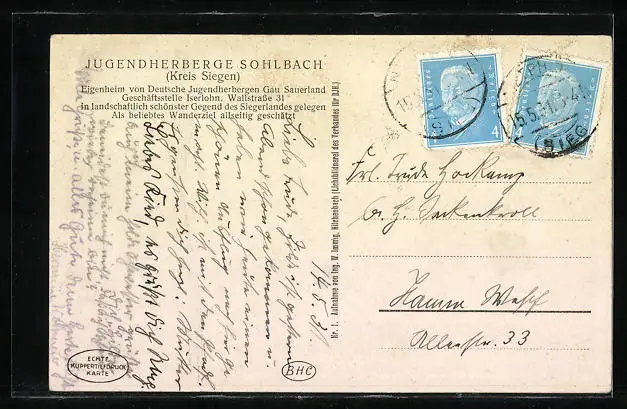Personenbezogene Daten auf der Rückseite der Karte wurden durch blauen Textmarker unkenntlich gemacht. Die blauen Stellen sind auf die Vorderseite durchgeweicht und wirken sich negativ auf das Postkartenfoto aus