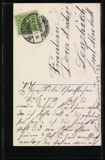 Personenbezogene Daten auf der Rückseite der Karte wurden durch blauen Textmarker unkenntlich gemacht. Die blauen Stellen sind auf die Vorderseite durchgeweicht und wirken sich negativ auf das Postkartenfoto aus