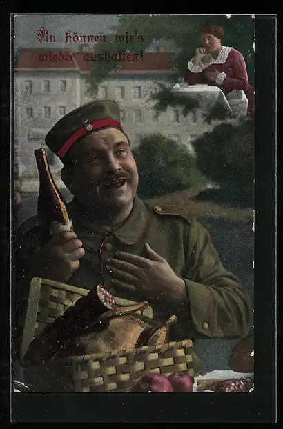 AK Soldat an einem Paket mit Essen von seiner Liebsten, Kriegsnot