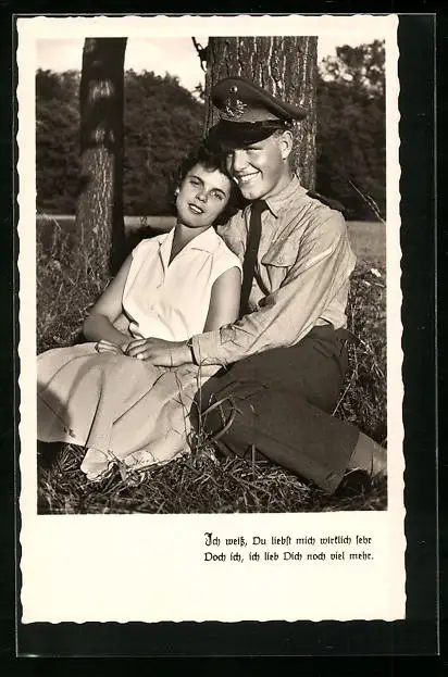 AK Soldat der Bundeswehr sitzt mit seiner Freundin auf der Wiese