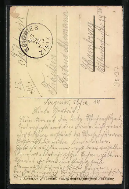 gelaufen 1914, Eckknicke links u. rechts, minimale Einrisse li. oben u. unten, guter Zustand