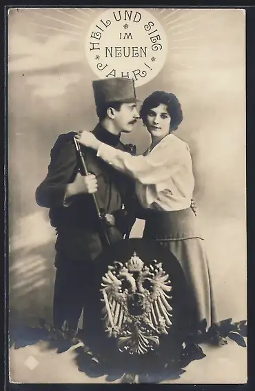 AK Soldat in Uniform mit Frau, Wappen, Neujahrsgruss