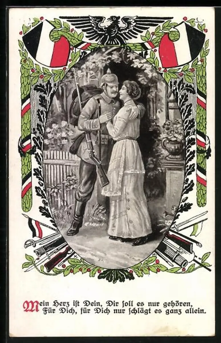 AK Soldat in Uniform mit Frau im Arm, Soldatenliebe