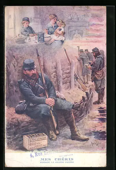 AK Soldat in Uniform mit Gewehr, Frau mit Kindern am Tisch, Reklame für Banania