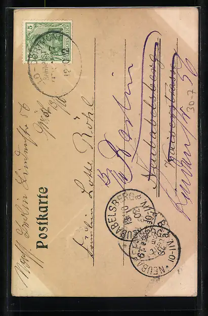 Personenbezogene Daten auf der Rückseite der Karte wurden durch blauen Textmarker unkenntlich gemacht. Die blauen Stellen sind auf die Vorderseite durchgeweicht und wirken sich negativ auf das Postkartenfoto aus