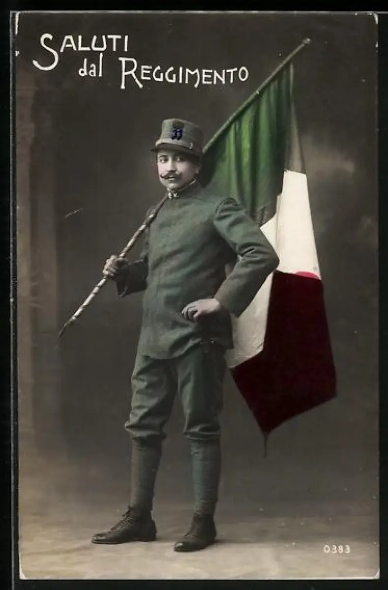 AK Soldat in Uniform mit italienischer Flagge, Saluti dal Reggimento