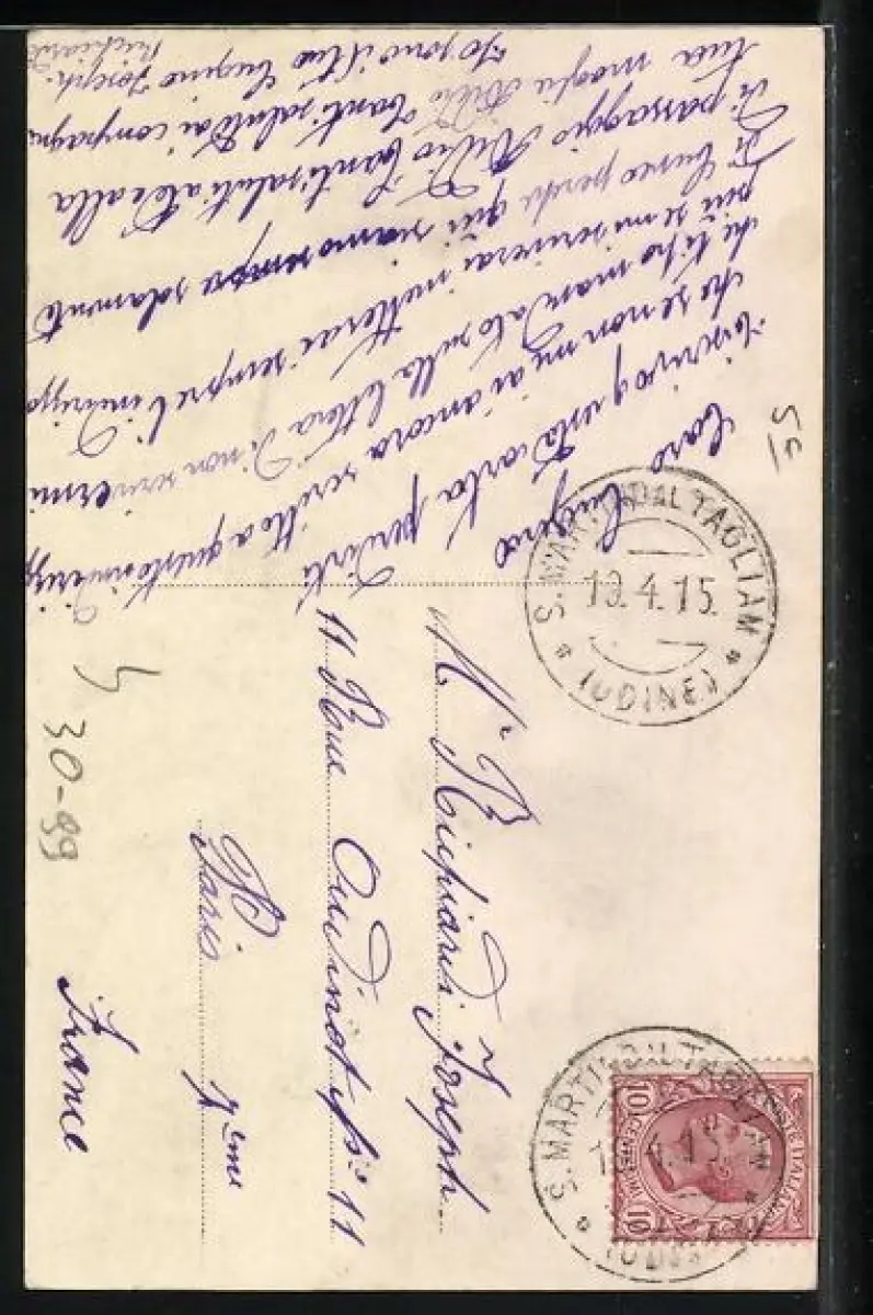 Personenbezogene Daten auf der Rückseite der Karte wurden durch blauen Textmarker unkenntlich gemacht. Die blauen Stellen sind auf die Vorderseite durchgeweicht und wirken sich negativ auf das Postkartenfoto aus