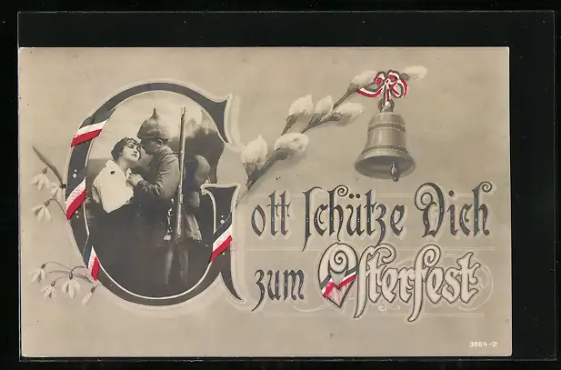 AK Soldat in Uniform mit seiner Frau, Oster-Passepartout mit Weidenkätzchen und Glocke