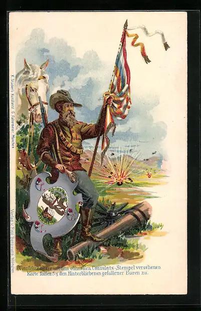 AK Soldat mit Fahne und Wappen, Burenkrieg
