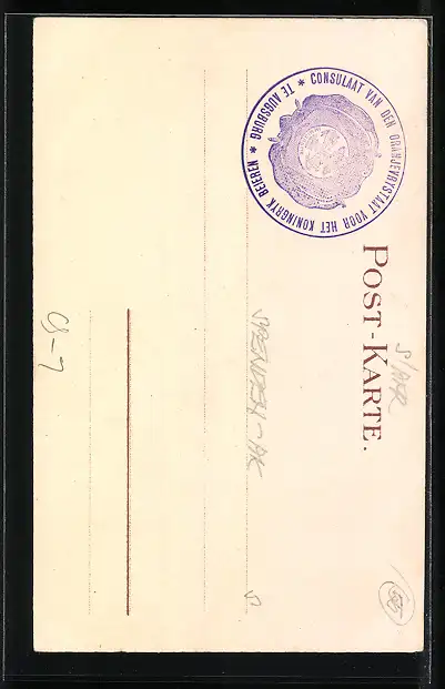 Personenbezogene Daten auf der Rückseite der Karte wurden durch blauen Textmarker unkenntlich gemacht. Die blauen Stellen sind auf die Vorderseite durchgeweicht und wirken sich negativ auf das Postkartenfoto aus
