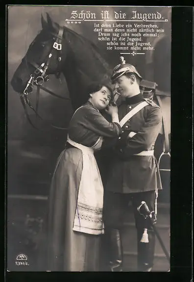 AK Soldat mit Geliebter vor Reitpferd