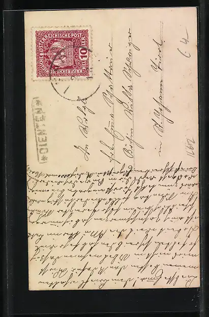 Personenbezogene Daten auf der Rückseite der Karte wurden durch blauen Textmarker unkenntlich gemacht. Die blauen Stellen sind auf die Vorderseite durchgeweicht und wirken sich negativ auf das Postkartenfoto aus