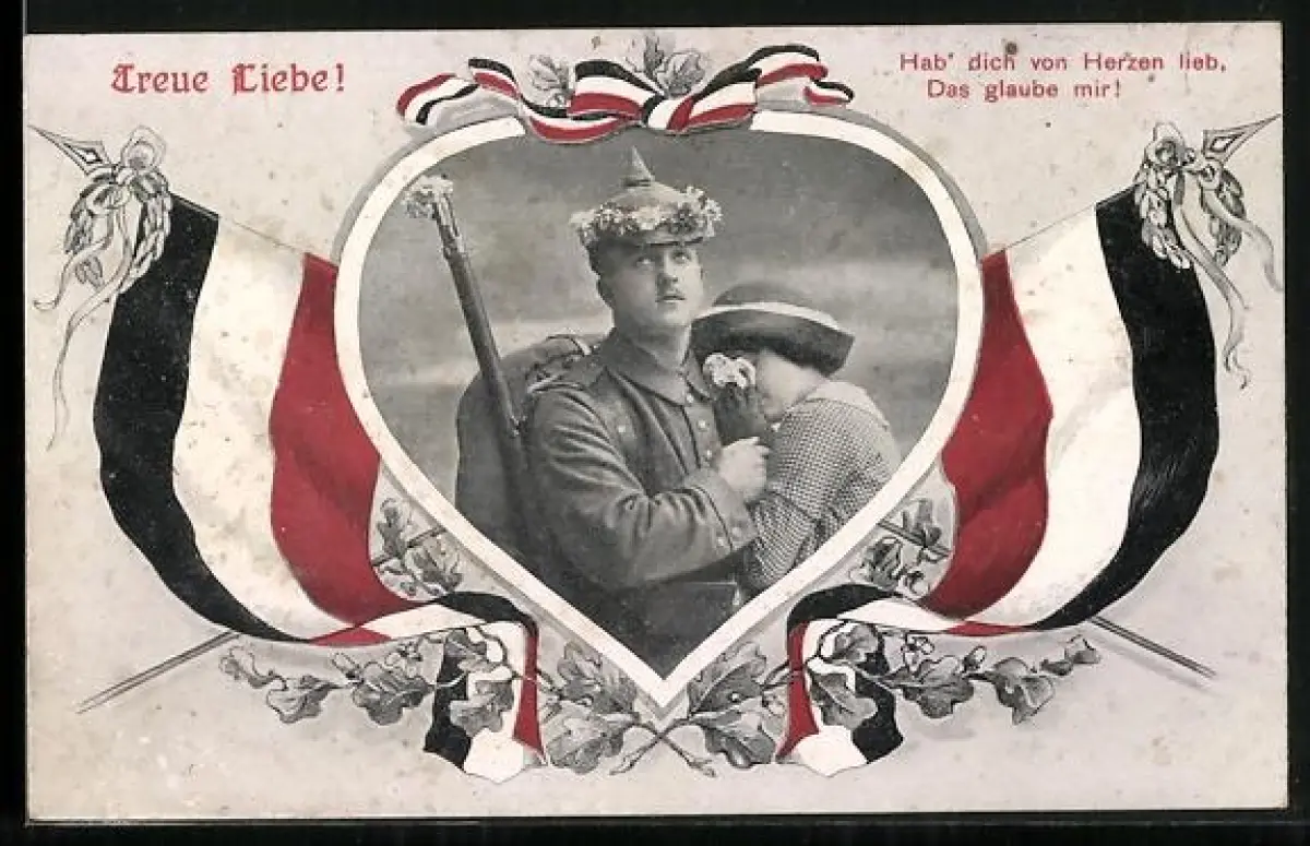 AK Soldat nimmt Abschied von seiner Liebsten, Reichsfahnen
