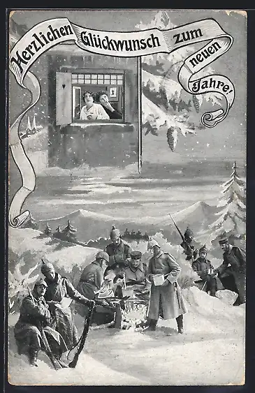 AK Soldaten im verschneiten Feld feiern Neujahr