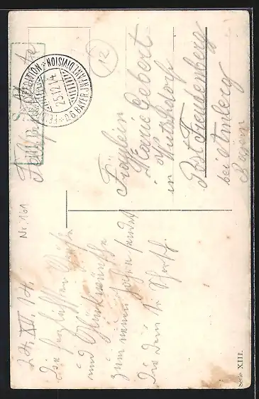 Personenbezogene Daten auf der Rückseite der Karte wurden durch blauen Textmarker unkenntlich gemacht. Die blauen Stellen sind auf die Vorderseite durchgeweicht und wirken sich negativ auf das Postkartenfoto aus
