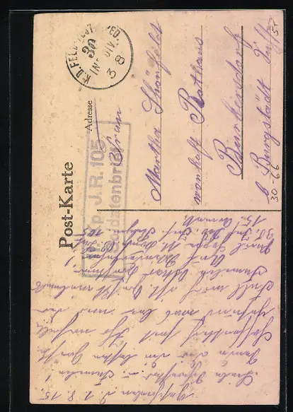 Personenbezogene Daten auf der Rückseite der Karte wurden durch blauen Textmarker unkenntlich gemacht. Die blauen Stellen sind auf die Vorderseite durchgeweicht und wirken sich negativ auf das Postkartenfoto aus