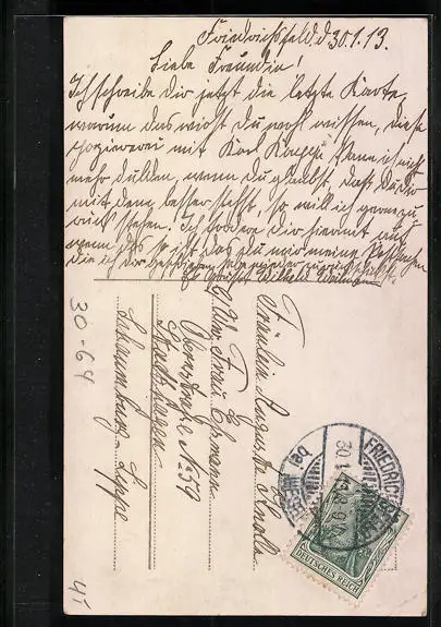 Personenbezogene Daten auf der Rückseite der Karte wurden durch blauen Textmarker unkenntlich gemacht. Die blauen Stellen sind auf die Vorderseite durchgeweicht und wirken sich negativ auf das Postkartenfoto aus