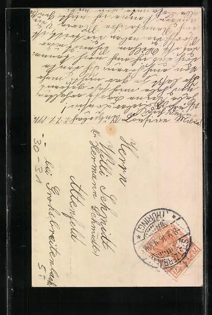 Personenbezogene Daten auf der Rückseite der Karte wurden durch blauen Textmarker unkenntlich gemacht. Die blauen Stellen sind auf die Vorderseite durchgeweicht und wirken sich negativ auf das Postkartenfoto aus