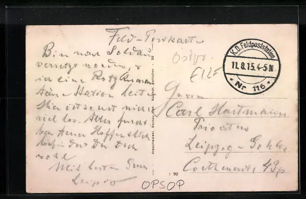 alte Ansichtskarte, gelaufen 1915 als Feldpost, Eckknick li. oben, Stempelspur, guter Zustand