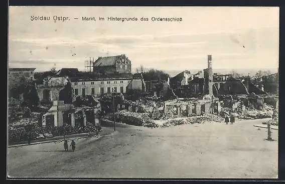 AK Soldau /Ostpr., Markt, Im Hintergrunde das Ordensschloss