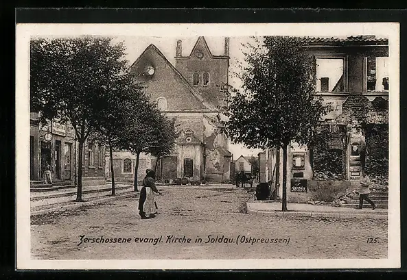 AK Soldau /Ostpreussen, Zerschossene evangl. Kirche