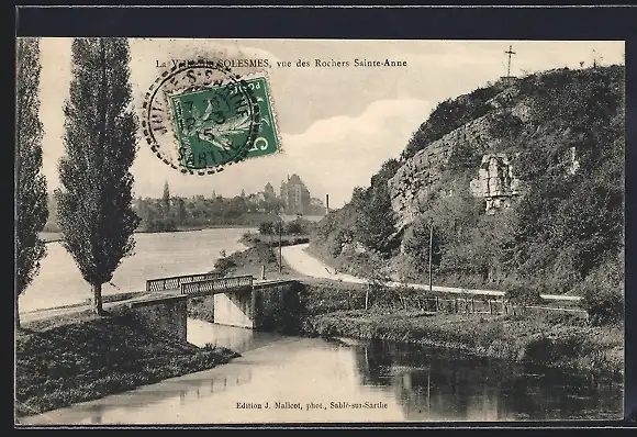 AK Solesmes, vue des Rochers Sainte-Anne et pont sur la rivière