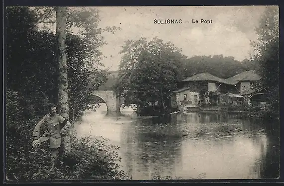 AK Solignac, Le Pont et rivière avec maisons environnantes