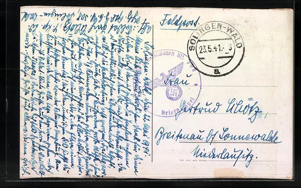 Personenbezogene Daten auf der Rückseite der Karte wurden durch blauen Textmarker unkenntlich gemacht. Die blauen Stellen sind auf die Vorderseite durchgeweicht und wirken sich negativ auf das Postkartenfoto aus